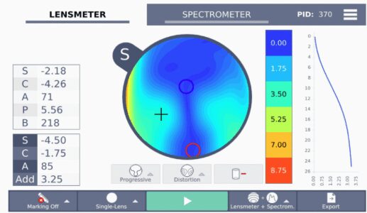 Par simple pression sur un bouton, le Solos mesure de manière entièrement automatique les valeurs sphériques et cylindriques, et détecte ainsi que mesure automatiquement les verres monofocaux et multifocaux. Il mesure également la transmission des UV-A, de la lumière bleue et de la lumière visible. (SOLOS, et non SOLOS Lite). Les données de mesure sont transmises sans fil ou via une connexion LAN.
