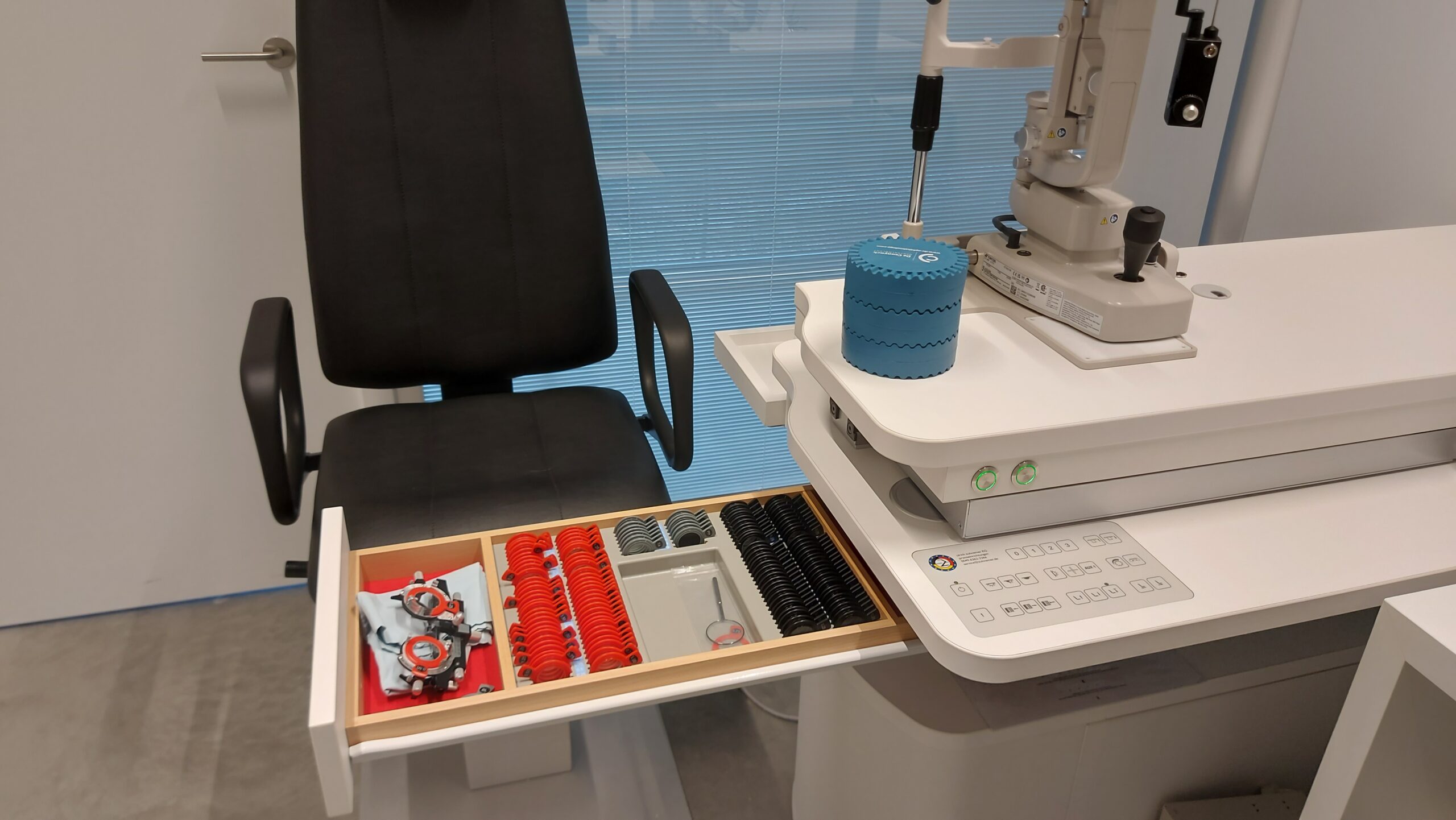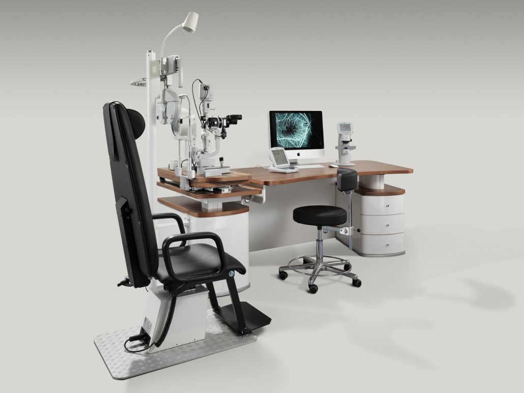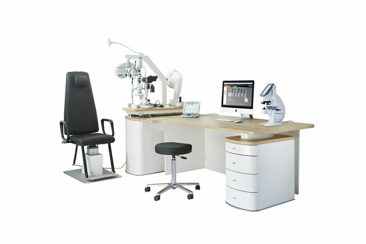 Een compacte onderzoeksunit met een schuif/dubbeltafel voor twee instrumenten.